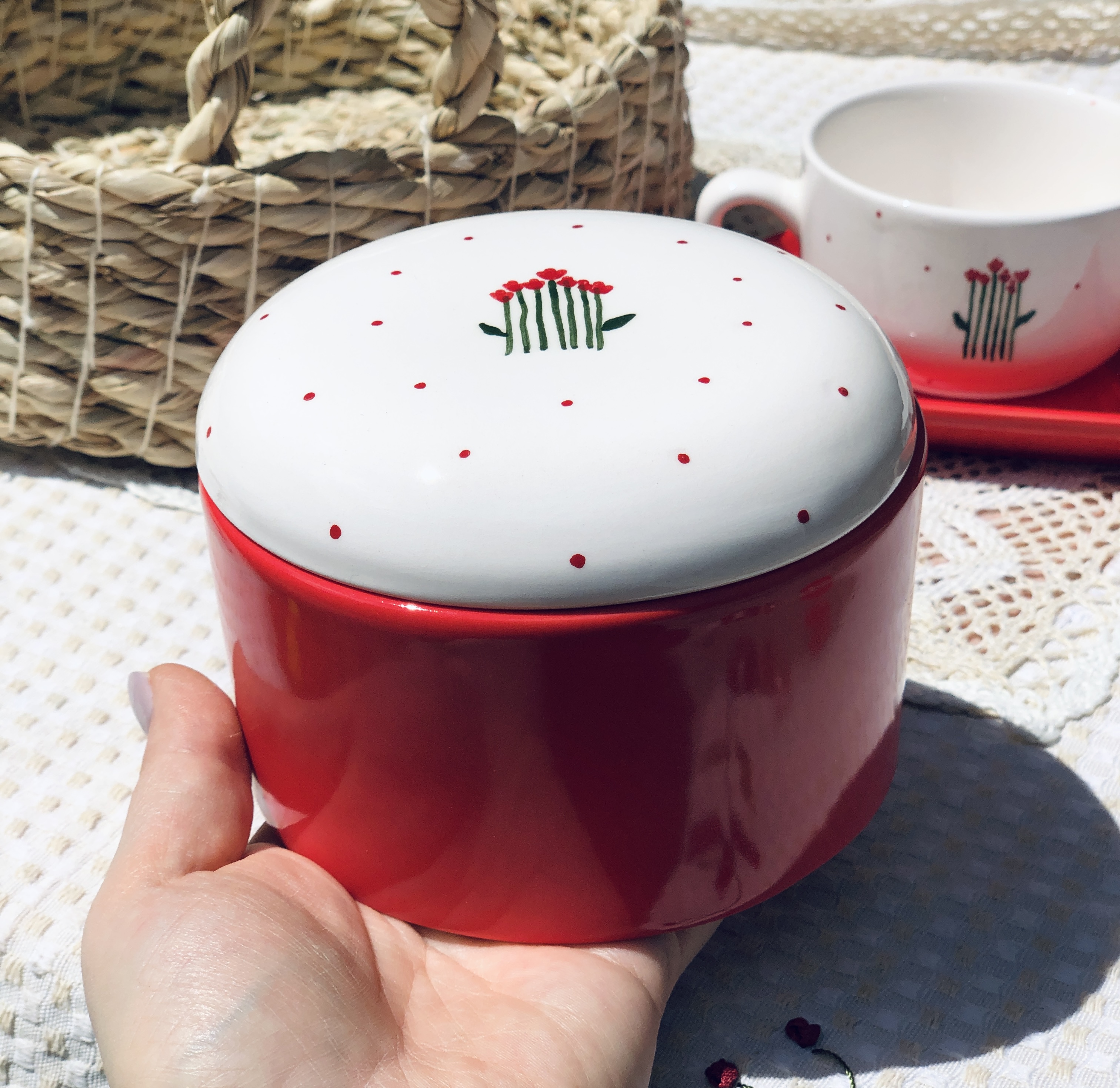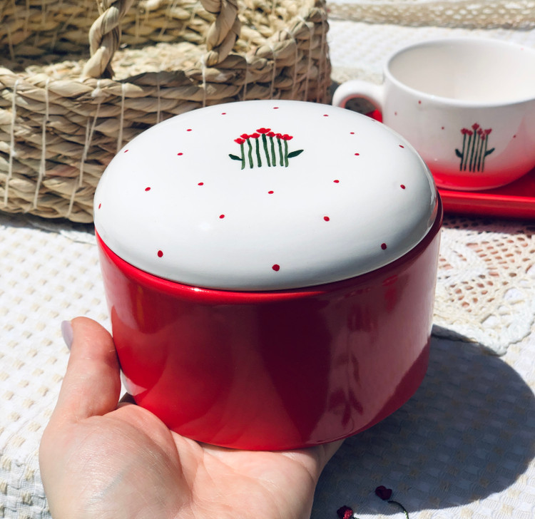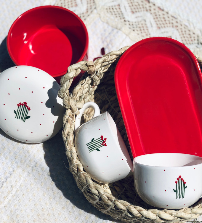 ست چایخوری دو نفره دست ساز سرامیکی/دوعدد فنجان(قطر۹سانت/ارتفاع ۵٫۵سانت)/یک عدد زیر فنجانی(۲۲٫۵در ۱۱٫۵سانت)/،یک عدد شکلات خوری درب دار(قطر۱۱٫۵سانت ارتفاع ۶سانت)